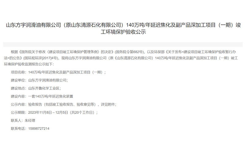 山東清源石化有限公司40萬(wàn)噸/年變壓器油技改項(xiàng)目(一期)竣工環(huán)境保護(hù)驗(yàn)收公示